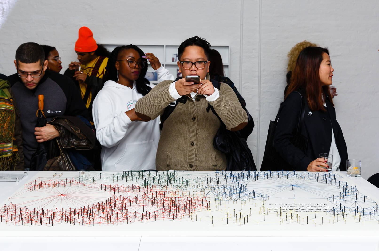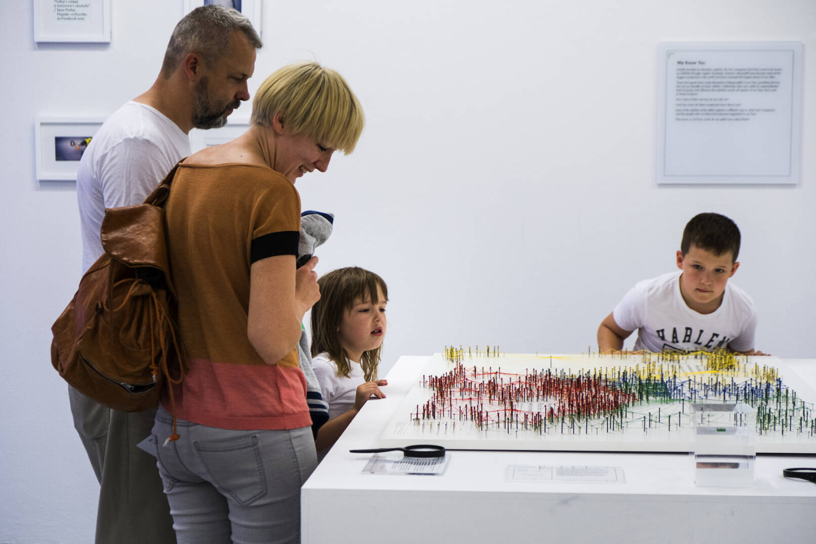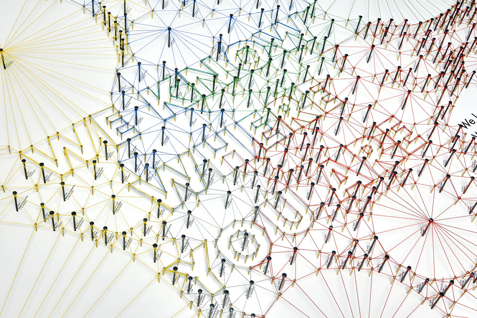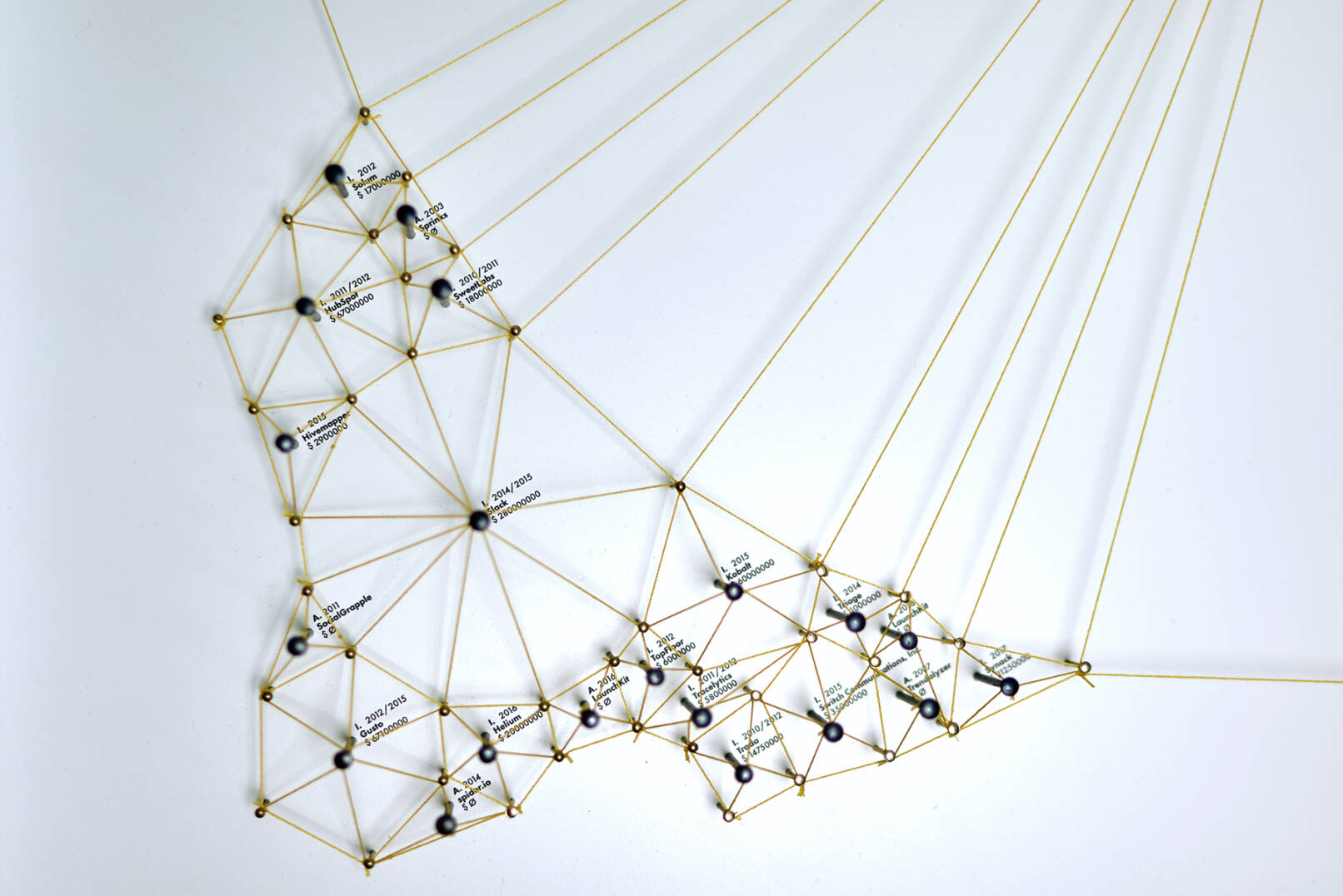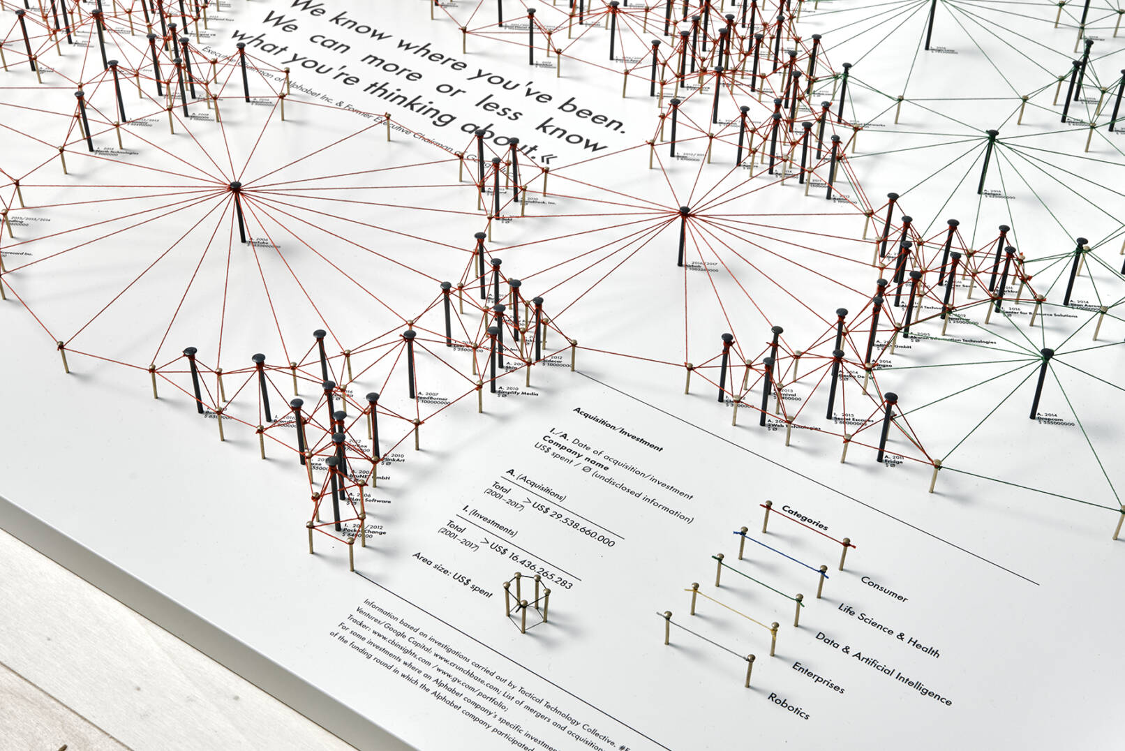 Die Nägel stehen für mehr als 180 Firmenaufkäufe und über 400 Investitionen seit Alphabets Gründung 1998. Die Farbe der Fäden zeigt den jeweiligen Interessensbereich an, während der Radius um eine Firma herum den für sie getätigten Ausgaben in US-Dollar entspricht. Auf den ersten Blick springen enorme Ausgaben wie für den Aufkauf von Motorola, Youtube oder Nest Labs Inc. ins Auge, aber auch die schiere Menge an „kleineren“ Investitionen demonstriert, wie weit das von Alphabet Inc. gespannte Netz ist. Die Arbeit macht die Interessengebiete und den enormen Einfluss von Alphabet auf zukünftige Technologien und deren Nutzer:innen sichtbar.