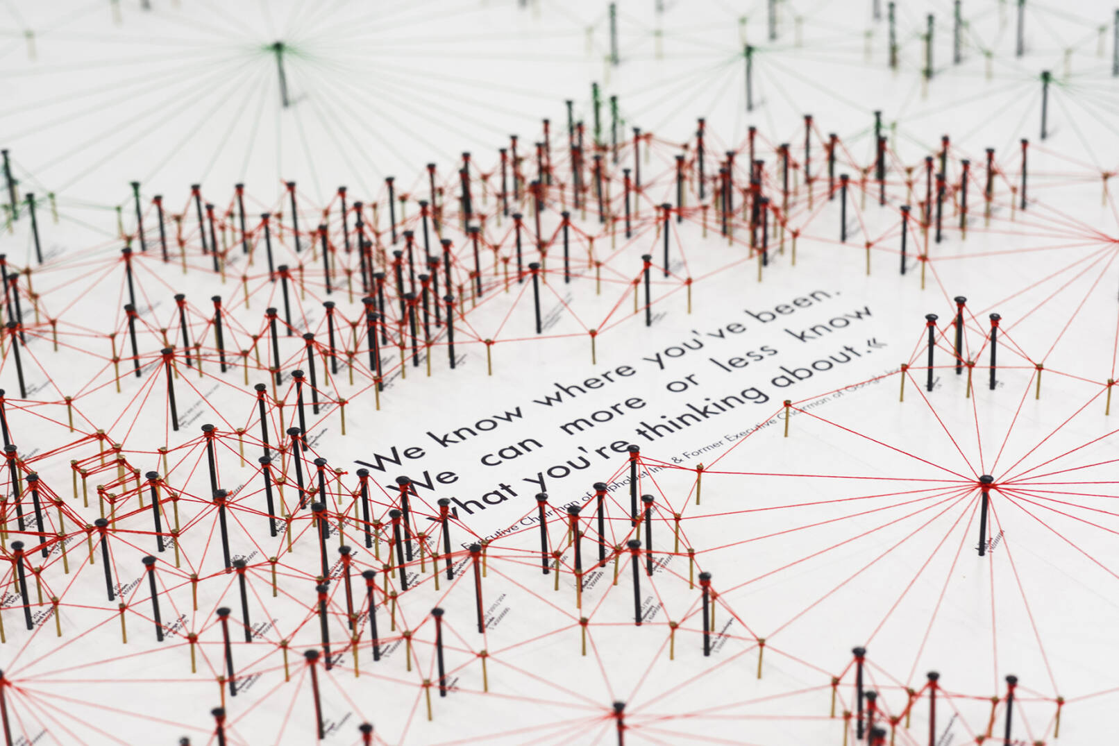 Im Zentrum von Alphabet Empire bildet ein Geflecht aus Fäden und Nägeln die Wörter „We know where you are“. Dieser verstörende Satz stammt von Eric Schmidt, dem ehemaligen Vorstandsvorsitzenden von Alphabet Inc., des gigantischen Unternehmens, zu dessen weltweit konkurrenzlosem Datenreichtum nicht nur Google beiträgt.