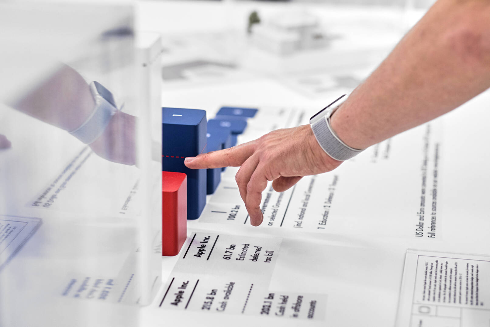 Es ist bekannt, dass die großen Techfirmen auch kreativ werden, wenn es darum geht, Steuern zurückzuhalten. „Apple Towers“ visualisiert eindrucksvoll, welche Konsequenzen dies für ganze Länder haben kann: Die Höhe des weißen Turms repräsentiert Apples zum Großteil auf Offshore-Konten angehäuften Reichtümer, der rote Turm zeigt, was der Konzern am Fiskus der USA vorbeiwirtschaftet und blaue Türme stehen für landesspezifische Kosten für Erziehung, Militär und mehr – Ausgaben, die weitgehend durch durch Apples Steuerzahlungen beglichen werden könnten.