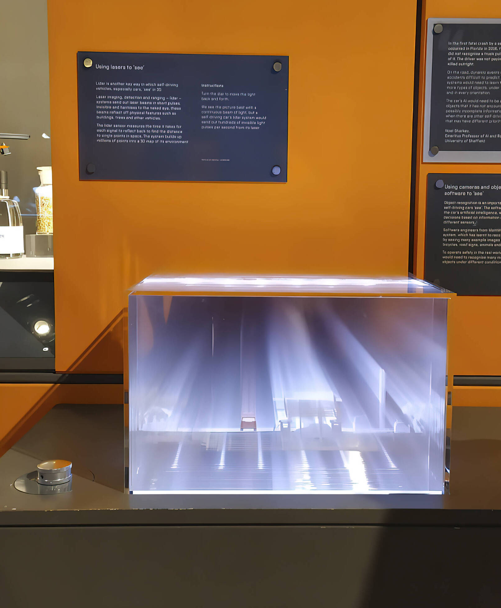 La Loma nutzte einen derart gewonnenen Datenschatz, um aus ihm einen kompletten Straßenabschnitt zu rekonstruieren und ihn für die Arbeit „Lidar“ in einen geschichteten Acrylblock zu drucken. Besucher:innen des Science Museums London konnten das detaillierte Panorama während einer Sonderausstellung mit LEDs interaktiv ausleuchten und nachvollziehen, wie viele Informationen allein durch ein vorbeifahrendes Auto generiert werden