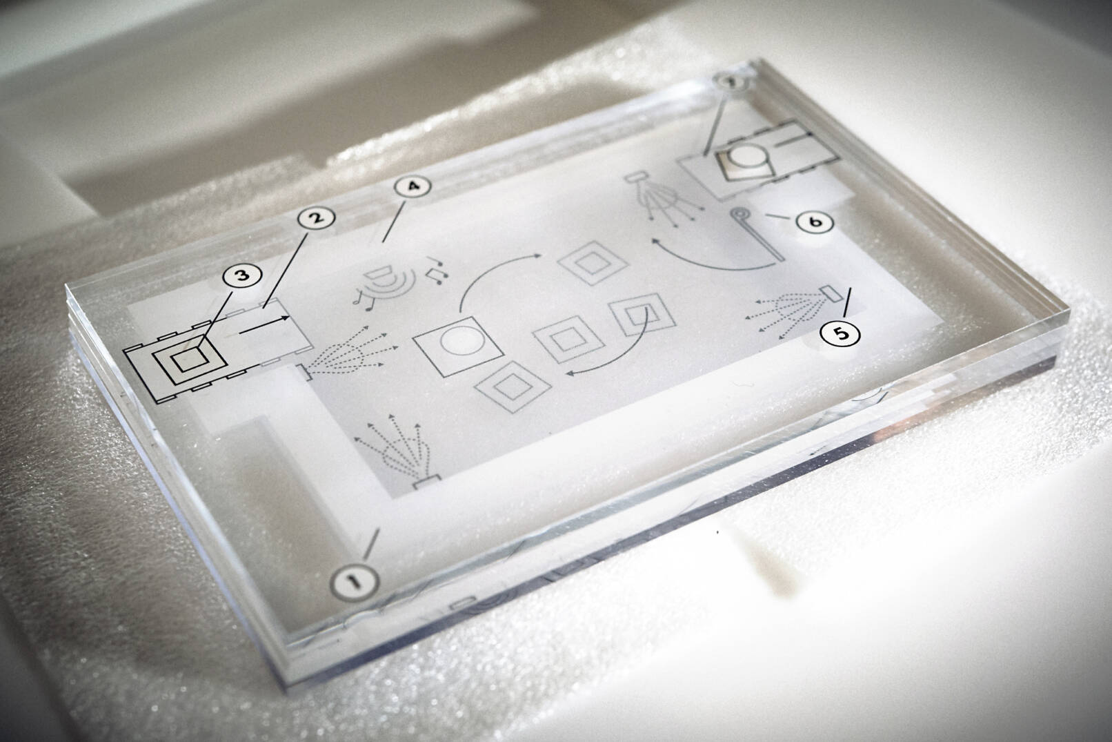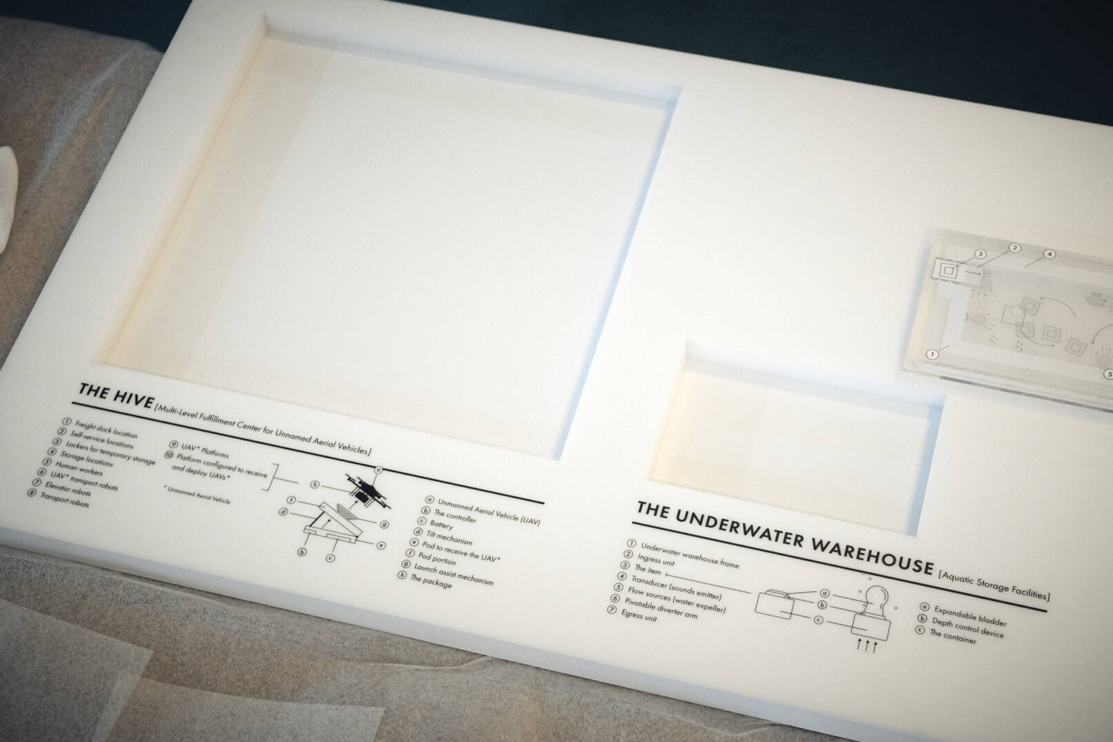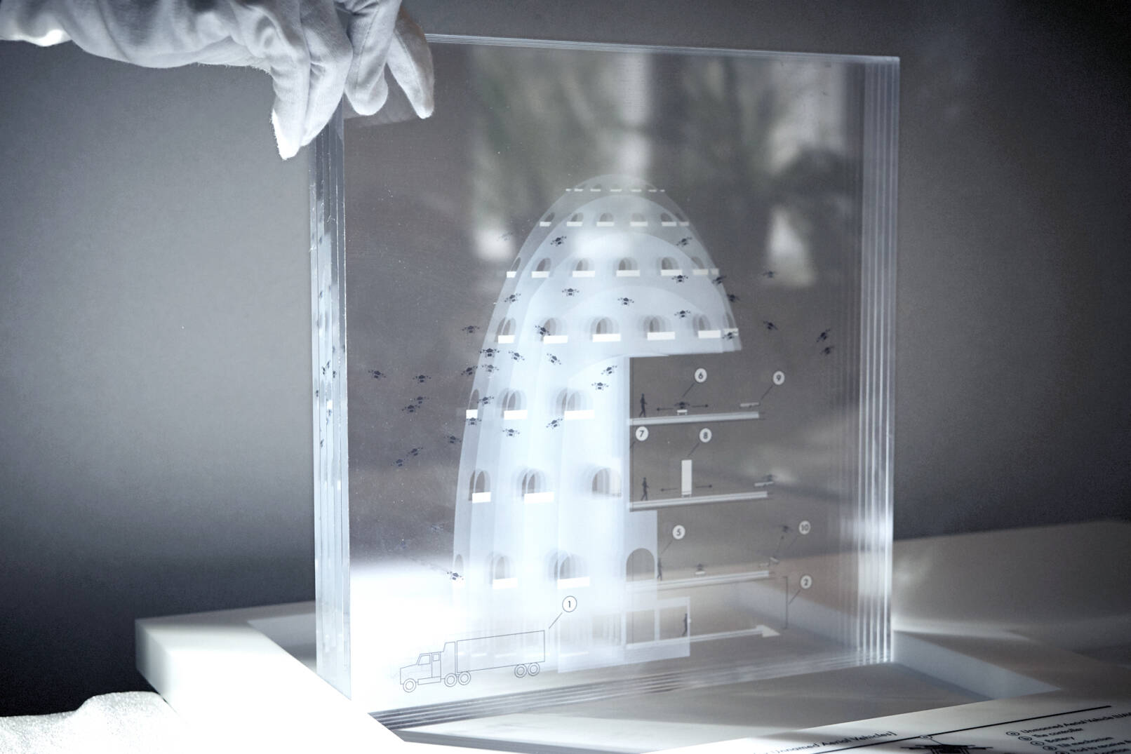 La Lomas „The Hive“ setzt Amazons Baupläne mit einem aus 30 Platten bestehenden Acrylblock um. Besucher:innen der Ausstellung können die einzelnen Ebenen durch Verschieben einer Taschenlampe erkunden und die Details dieser Patentidee schichtweise ins Licht rücken.
