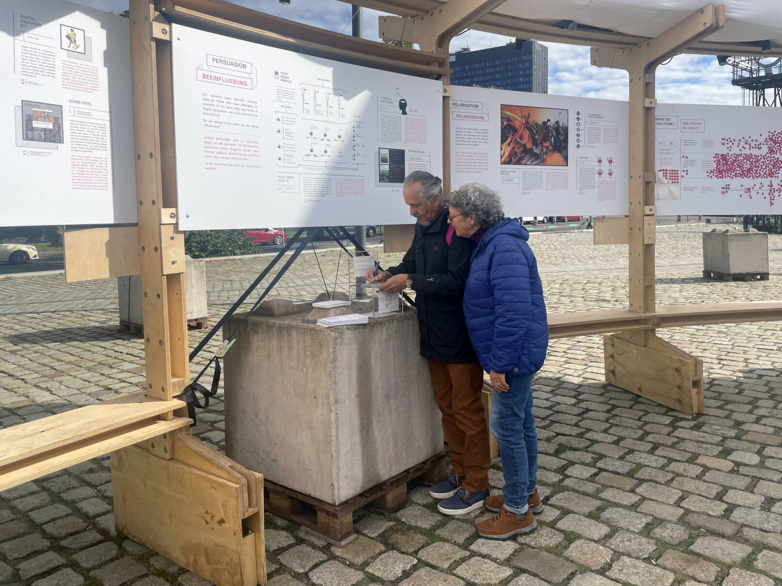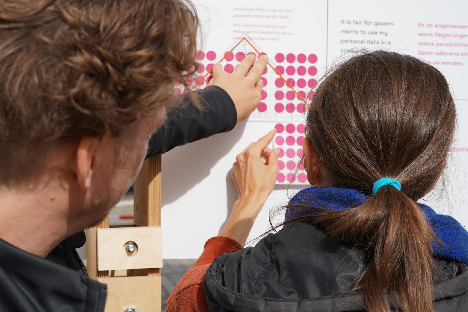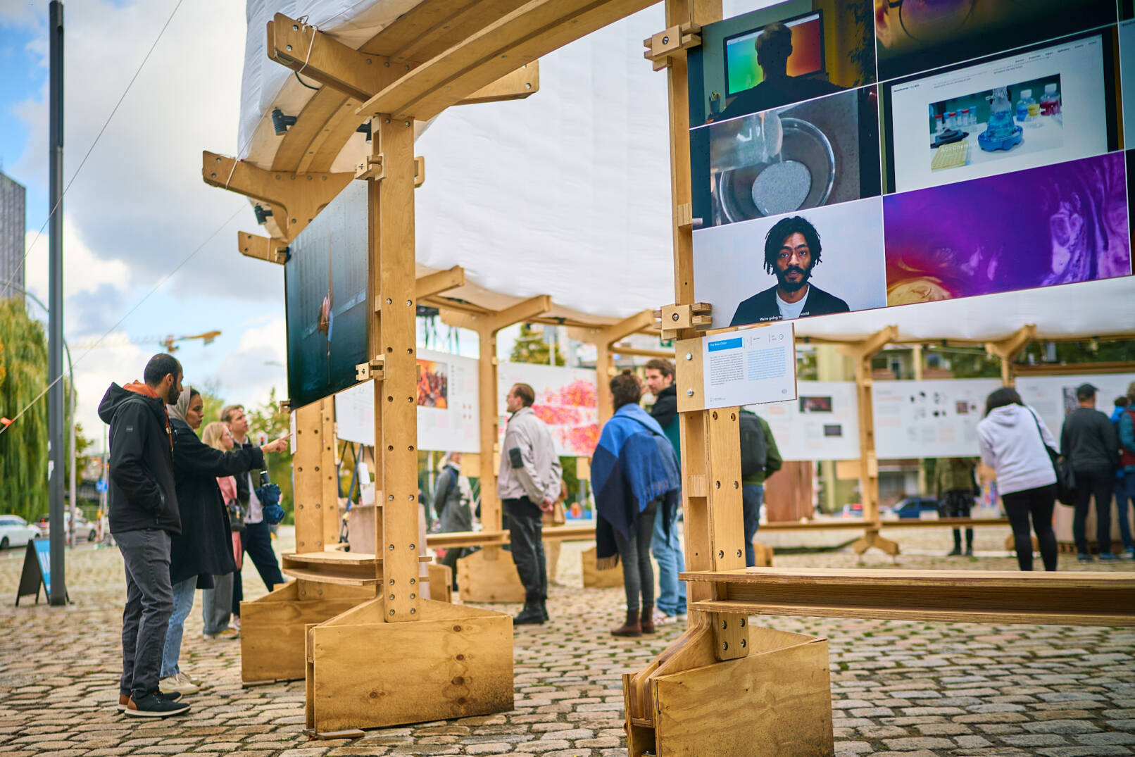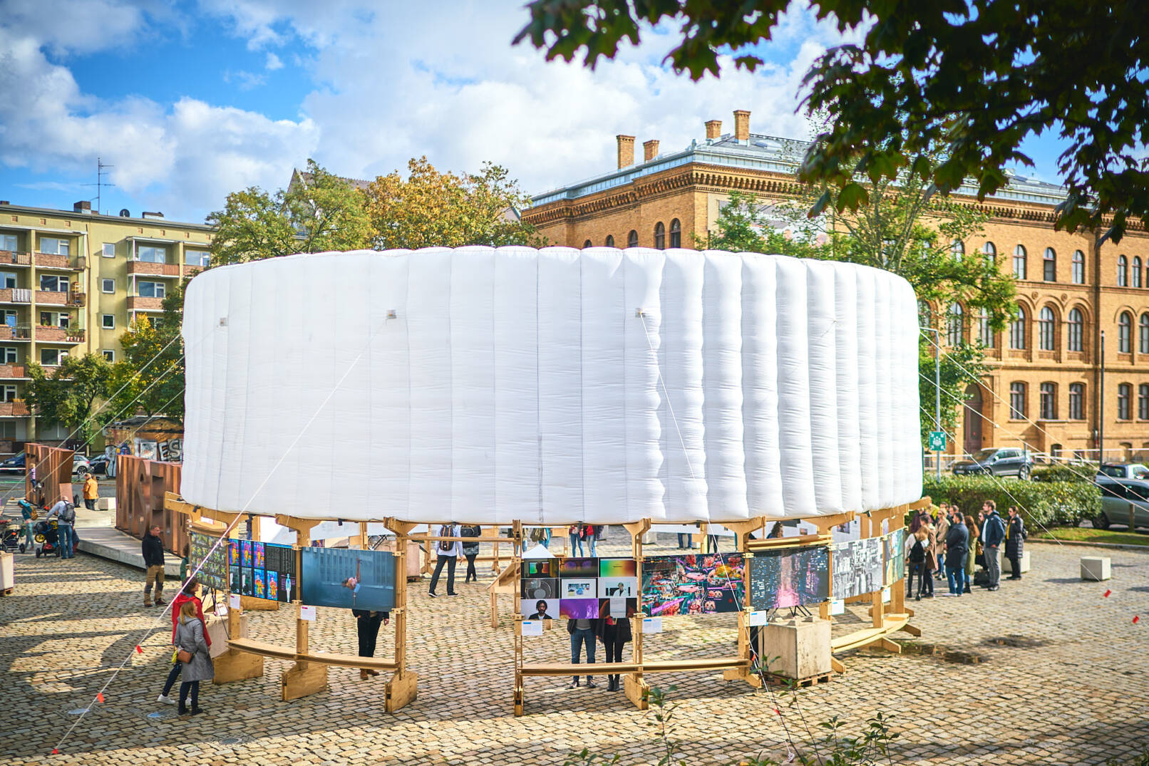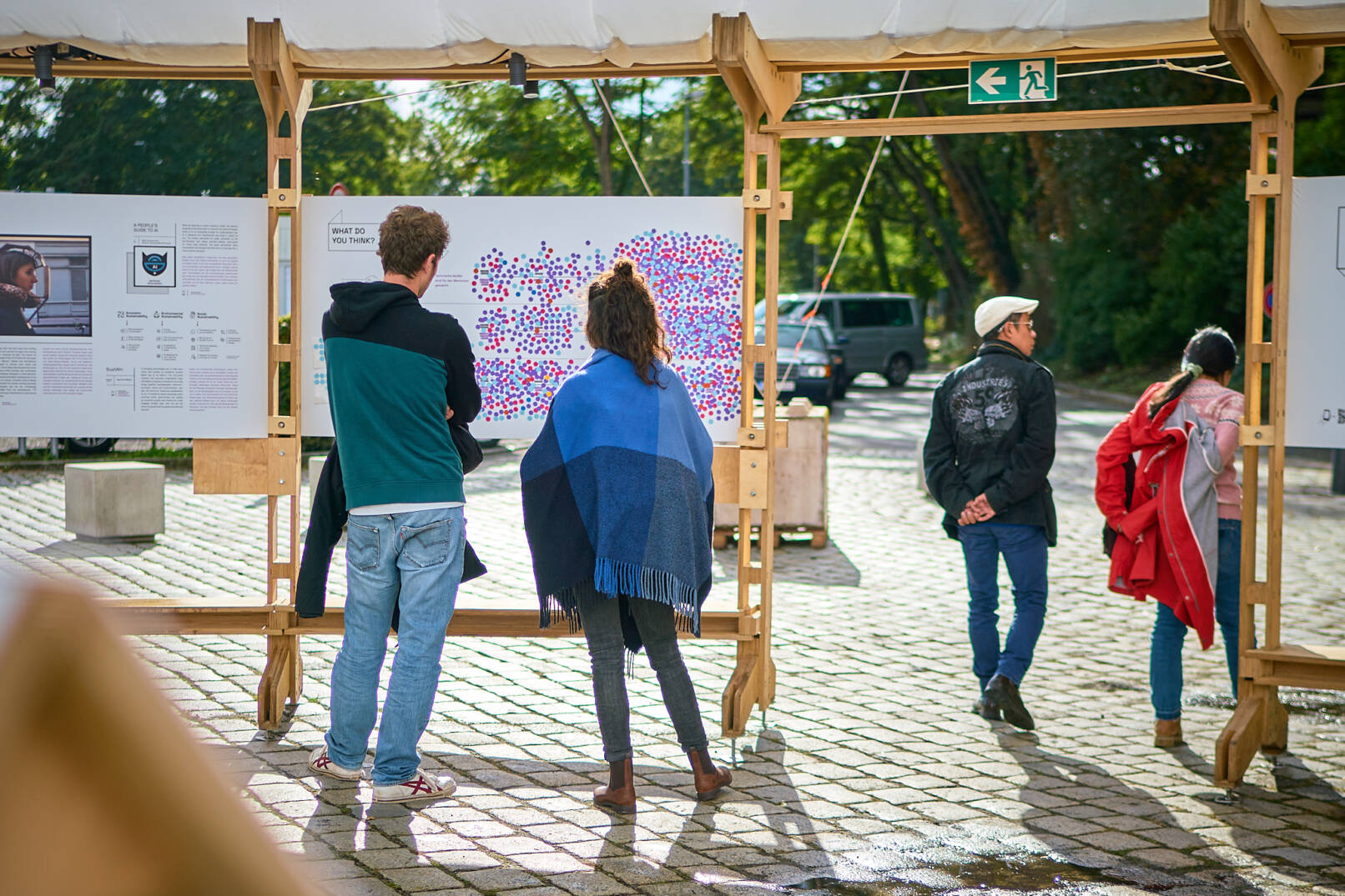 The striking white balloon ring invited visitors to take a closer look at the open-air exhibition in front of the German Museum of Technology. Large-format artworks on the themes of Digital Panic, Caution, Doubt, and Hope greeted visitors. La Loma designed the 20 inner panels of the exhibition ring, presenting different perspectives on the four theme areas through interventions, investigations, research projects, and artworks. Each area ended with an interactive spectogram, inviting guests to actively participate and express their opinions.