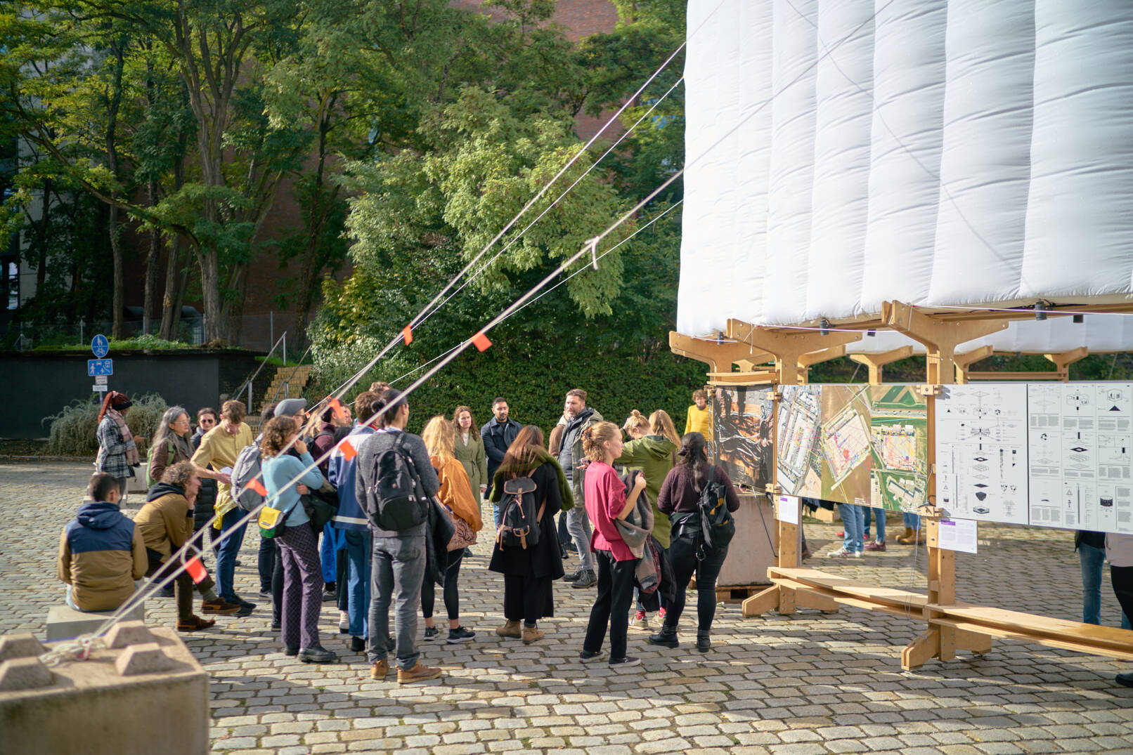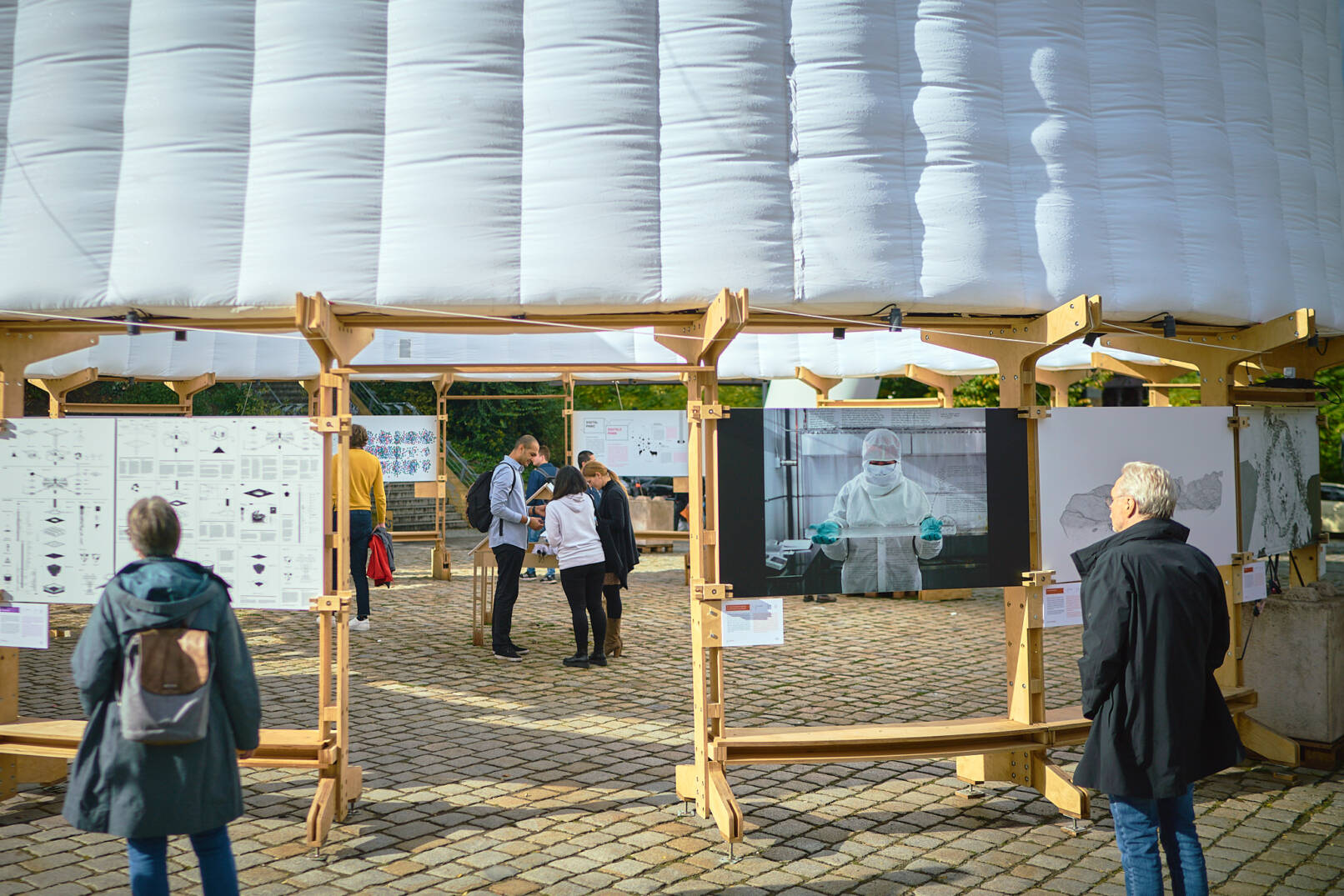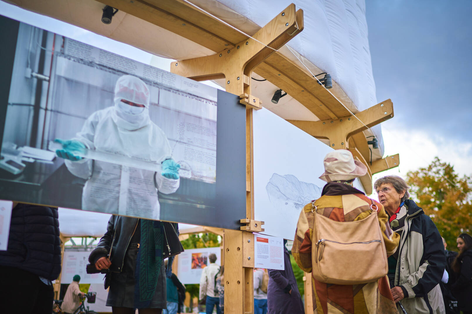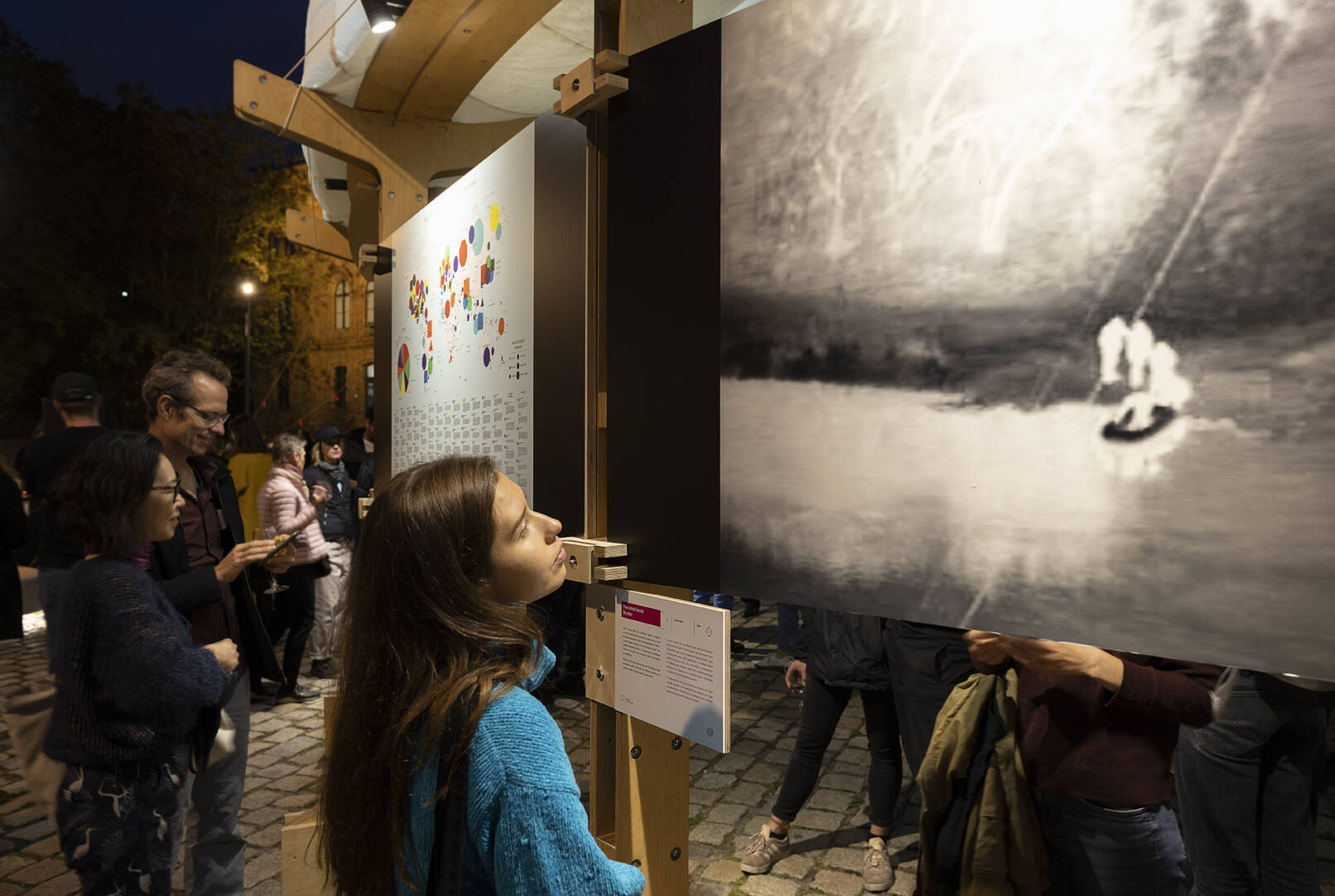 The striking white balloon ring invited visitors to take a closer look at the open-air exhibition in front of the German Museum of Technology. Large-format artworks on the themes of Digital Panic, Caution, Doubt, and Hope greeted visitors. La Loma designed the 20 inner panels of the exhibition ring, presenting different perspectives on the four theme areas through interventions, investigations, research projects, and artworks. Each area ended with an interactive spectogram, inviting guests to actively participate and express their opinions.