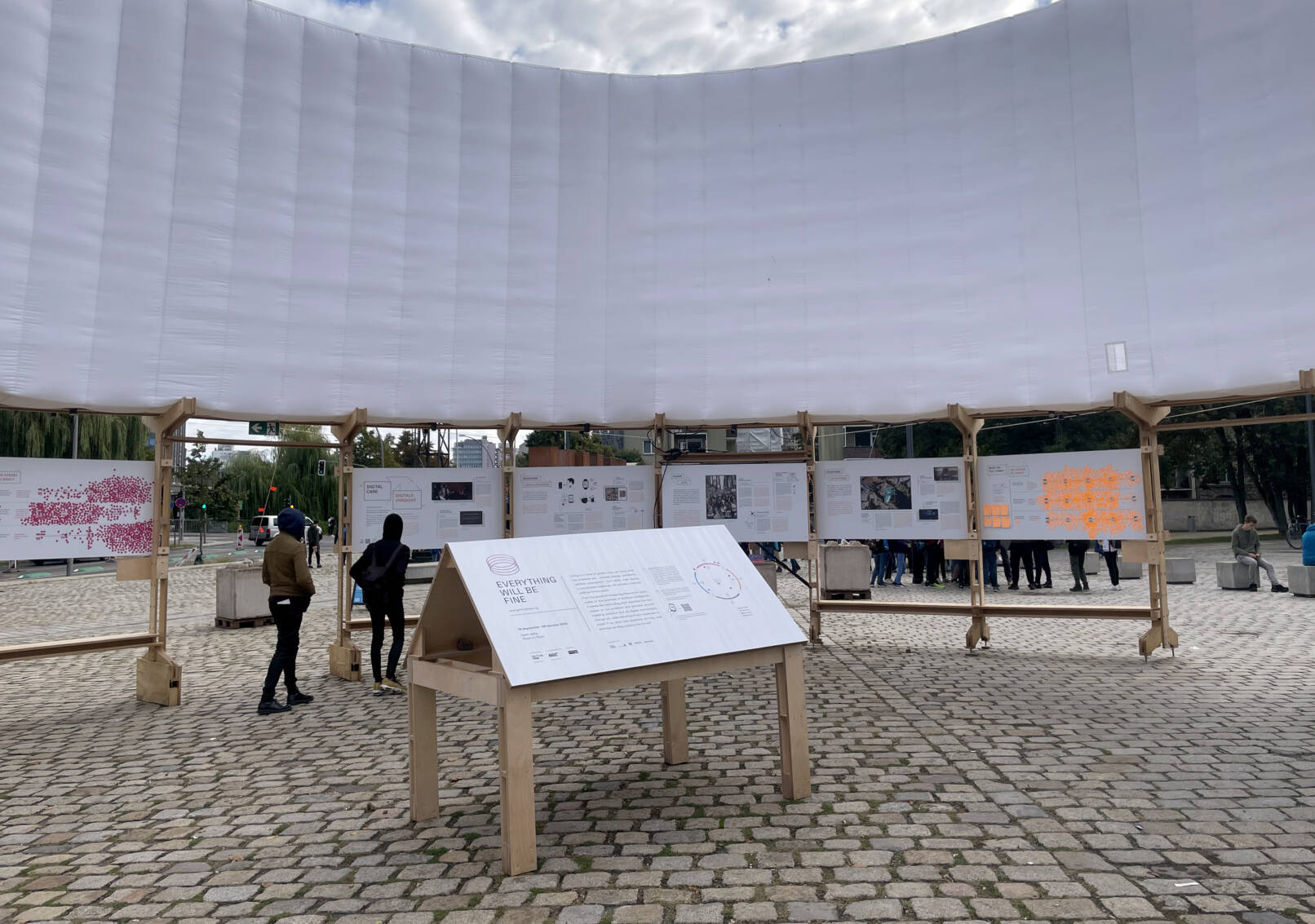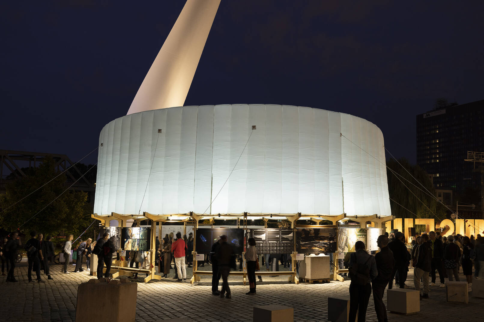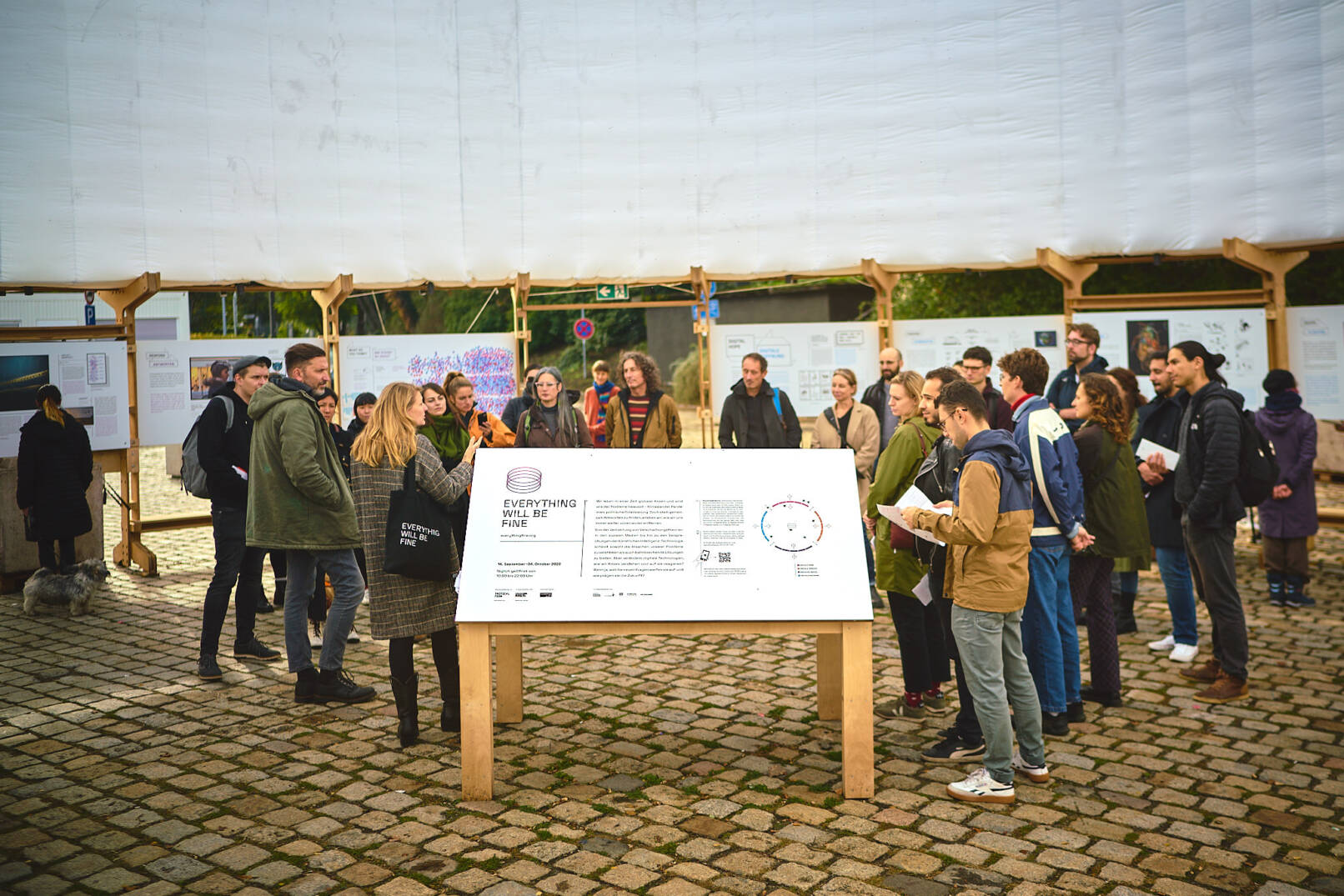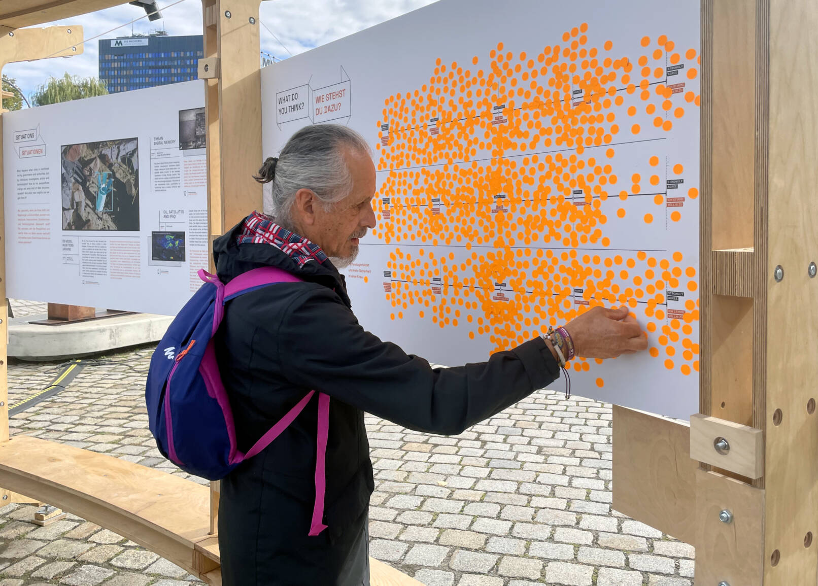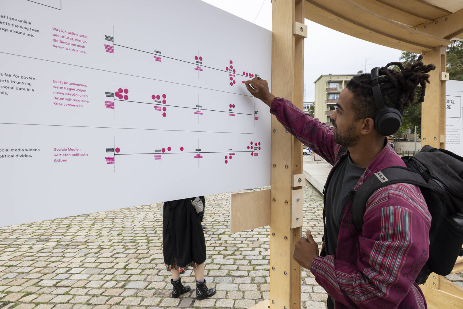 The striking white balloon ring invited visitors to take a closer look at the open-air exhibition in front of the German Museum of Technology. Large-format artworks on the themes of Digital Panic, Caution, Doubt, and Hope greeted visitors. La Loma designed the 20 inner panels of the exhibition ring, presenting different perspectives on the four theme areas through interventions, investigations, research projects, and artworks. Each area ended with an interactive spectogram, inviting guests to actively participate and express their opinions.