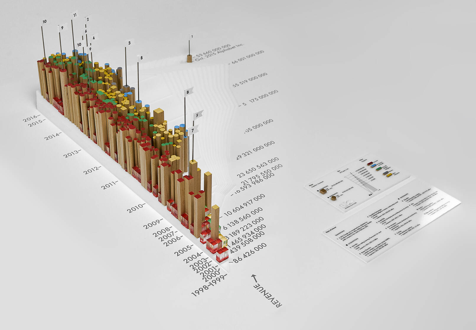 “The Google Empire” translates the incalculable amount of abstract information about Google’s widespread interests and entanglements into a three-dimensional infographic. An area diagram of the growing revenue serves as the basis on which numerous 3D bars are shown. These are coloured and shaped in such a way that they reflect all the investments and acquisitions since the company was founded from 1998 to 2016. Significant expenditures are marked with a flag and are detailed in the legend.