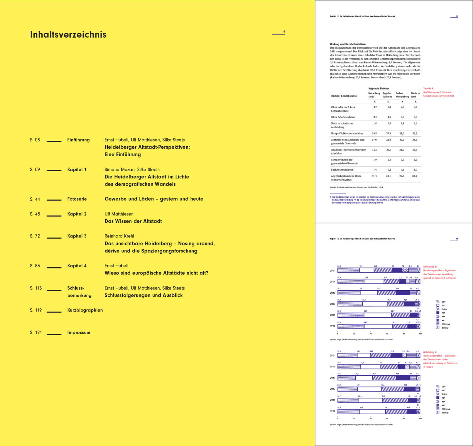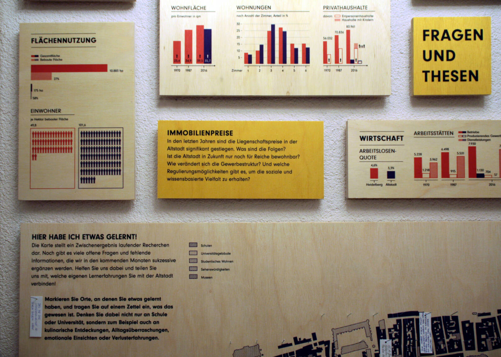These and other questions were at the heart of the International Building Exhibition (IBA) in Heidelberg, whose interim presentation was on show from April to July 2018. For this purpose, La Loma translated facts about urban development, and the collaborative field research of the project managers Ernst Hubeli, Ulf Matthiesen and Silke Steets, into information graphics. Visitors to the exhibition were able to interactively mark places on a map of the old town where they had personally learned something – be it academically, culinary or in everyday life – and describe their experience on a piece of paper. The information gathered during the exhibition was incorporated into the research of the project team.